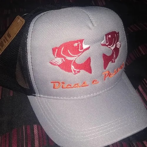Boné Pesca ou Passeio de cor Cinza claro com tela preta aba curva, emblema bordado na cor vermelha, nome do canal “Dicas e Pescas” bordado em laranja.
