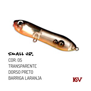 Small jr A Small Jr é uma isca com ação “zara/stick”. Como zara pode ser trabalhada de forma rápida ou lenta e emite um forte barulho porque possui esferas de aço no seu interior. Como stick, produz bolhas na superfície devido a boca de Popper. Indicada para pesca de Tucunarés, Robalos, Traíras, pequenos Xaréus e outros.